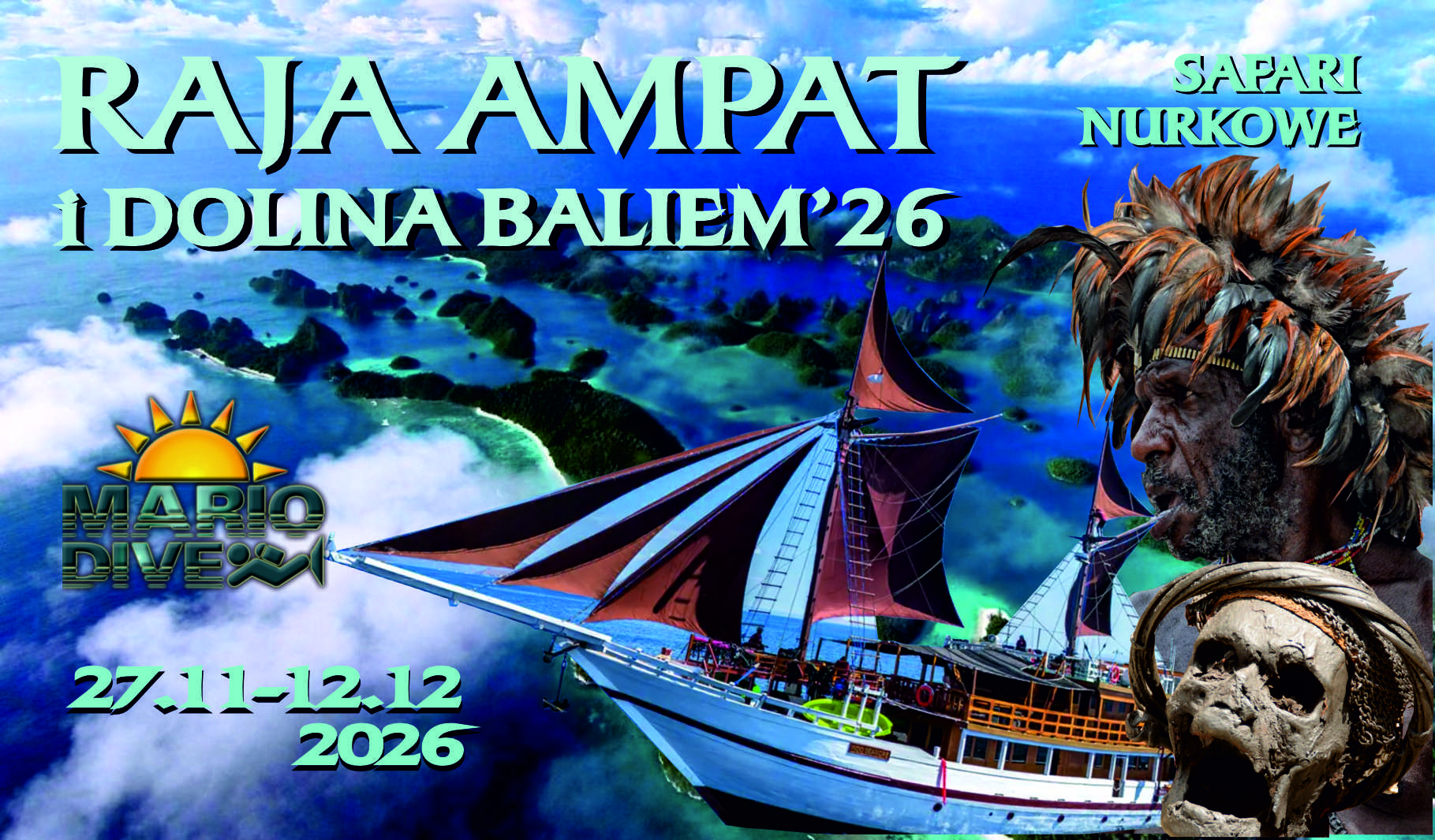 Uzupełniając wyprawę, do nurkowej eskapady dodajemy czterodniową trekingową wizytę w legendarnej dolinie Baliem – zagubionej w górach, w sercu Wschodniej Papui, oazie rdzennych, papuaskich mieszkańców. Wyprawa w miejsce jakich kilka pozostało jeszcze na mapie Świata, w którym czas się zatrzymał, a mogli je zobaczyć tylko nieliczni turyści. Spotkanie z ludźmi, którzy naprawdę chodzą nago, uprawiają dzikie słodkie ziemniaki, a ich zwyczaje nie zmieniły się od setek lat ( z ludźmi, którzy najprawdopodobniej skonsumowali też syna Rockefelera ) …
