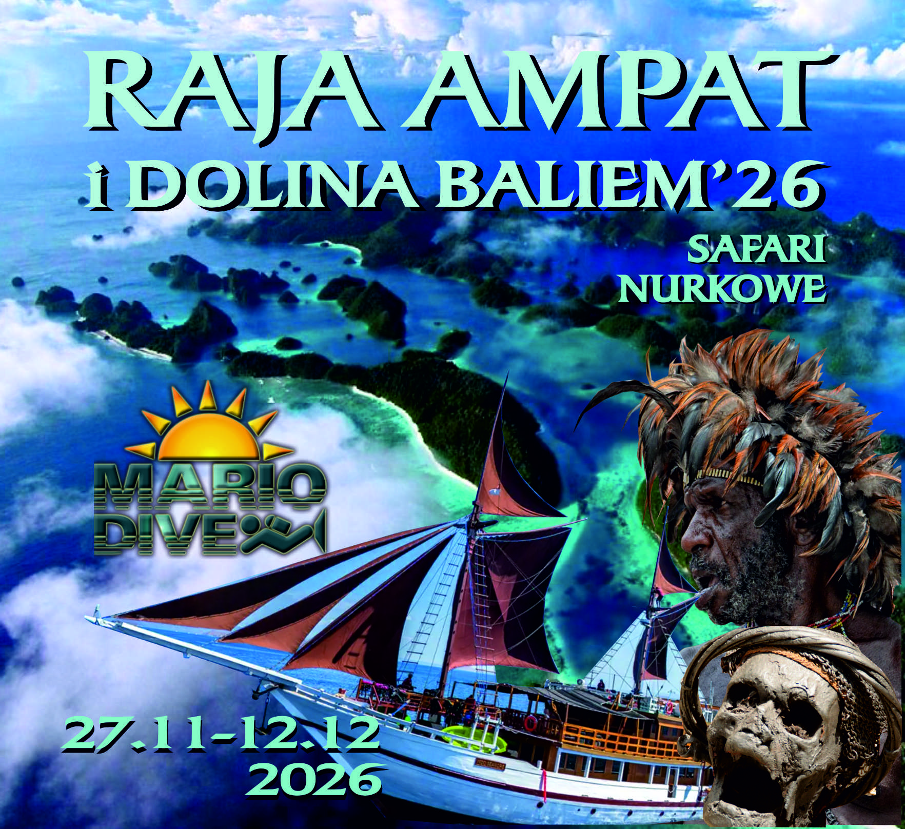 Uzupełniając wyprawę, do nurkowej eskapady dodajemy czterodniową trekingową wizytę w legendarnej dolinie Baliem – zagubionej w górach, w sercu Wschodniej Papui, oazie rdzennych, papuaskich mieszkańców. Wyprawa w miejsce jakich kilka pozostało jeszcze na mapie Świata, w którym czas się zatrzymał, a mogli je zobaczyć tylko nieliczni turyści. Spotkanie z ludźmi, którzy naprawdę chodzą nago, uprawiają dzikie słodkie ziemniaki, a ich zwyczaje nie zmieniły się od setek lat ( z ludźmi, którzy najprawdopodobniej skonsumowali też syna Rockefelera ) …